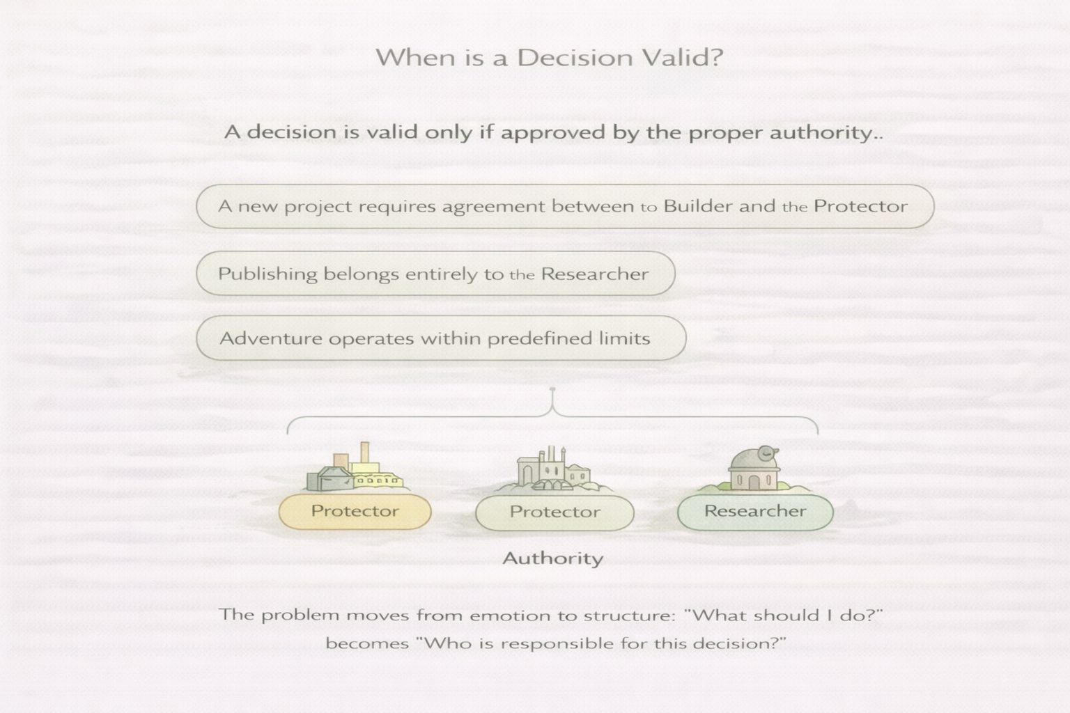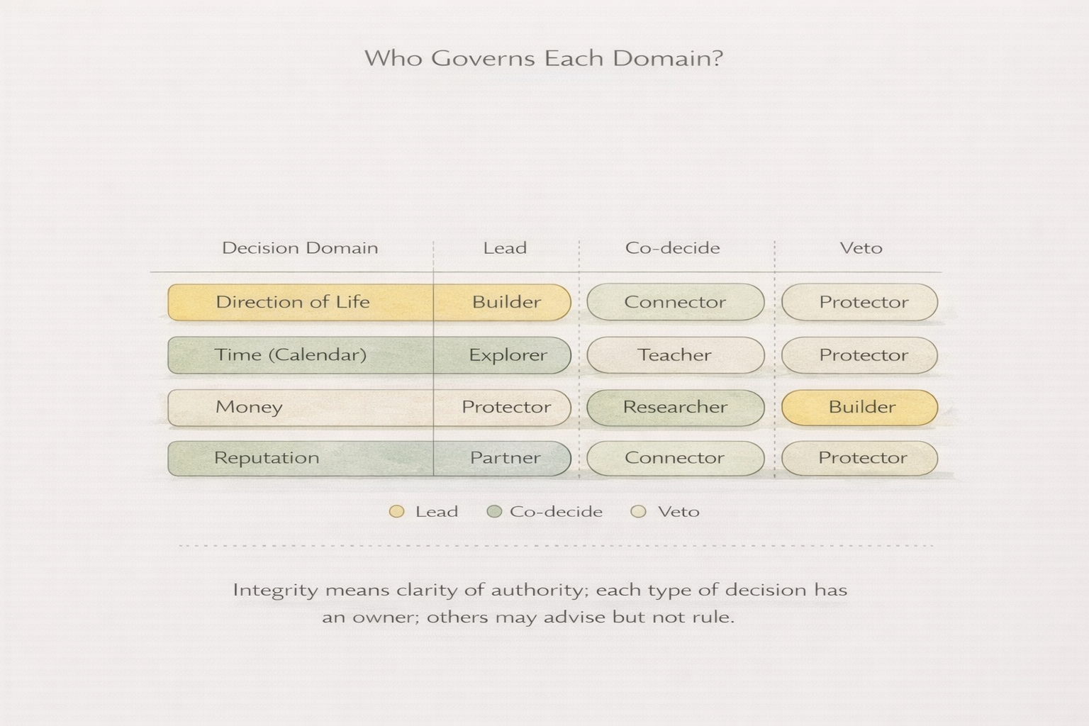 Integrity here does not mean consistency of personality. It means clarity of authority. Each type of decision has an owner; others may advise but not rule.